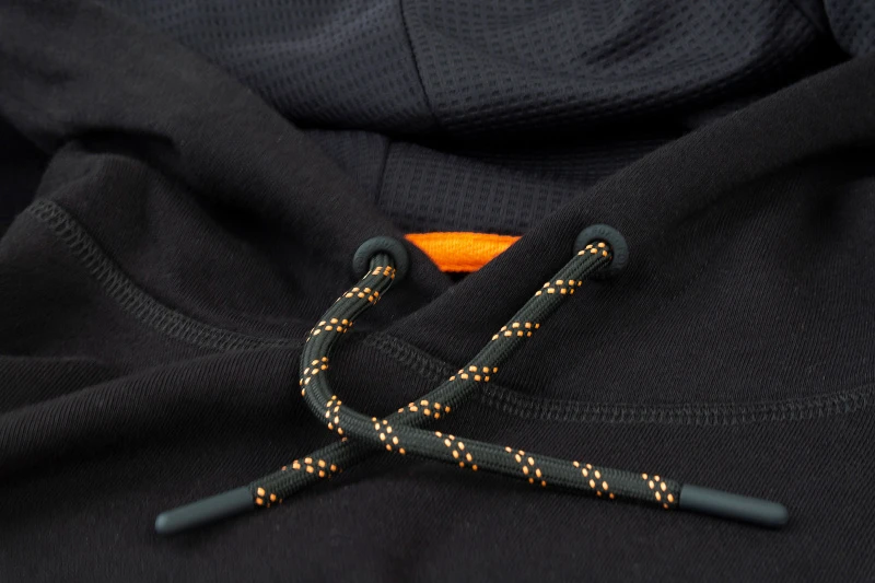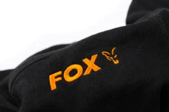 Een zwarte hoody met een oranje geborduurd Fox logo.