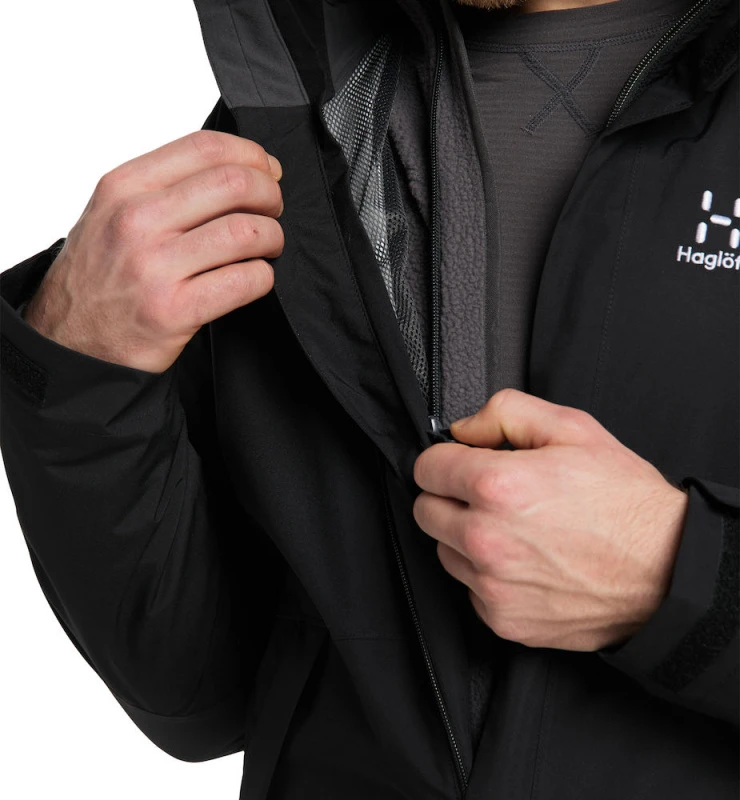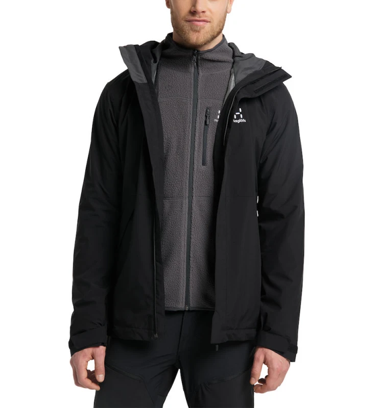 Haglöfs Stuga 3-in-1 Jacket Men True Black is een slimme en veelzijdige jas met een ademende, winddichte en waterdichte buitenlaag en een uitneembare binnenjas. Draag hem met beide jassen of apart, afhankelijk van het weer!