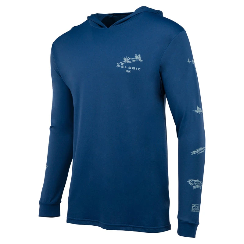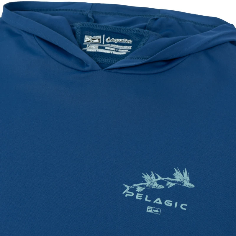 Pelagic Aquatek Hoodie Gyotaku Smokey Blue is een ademende en zonwerende hoodie. Een trui in extra zacht materiaal en unieke print!